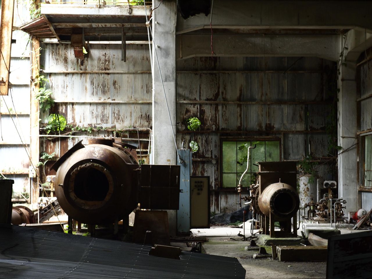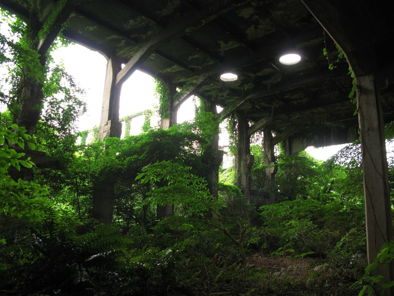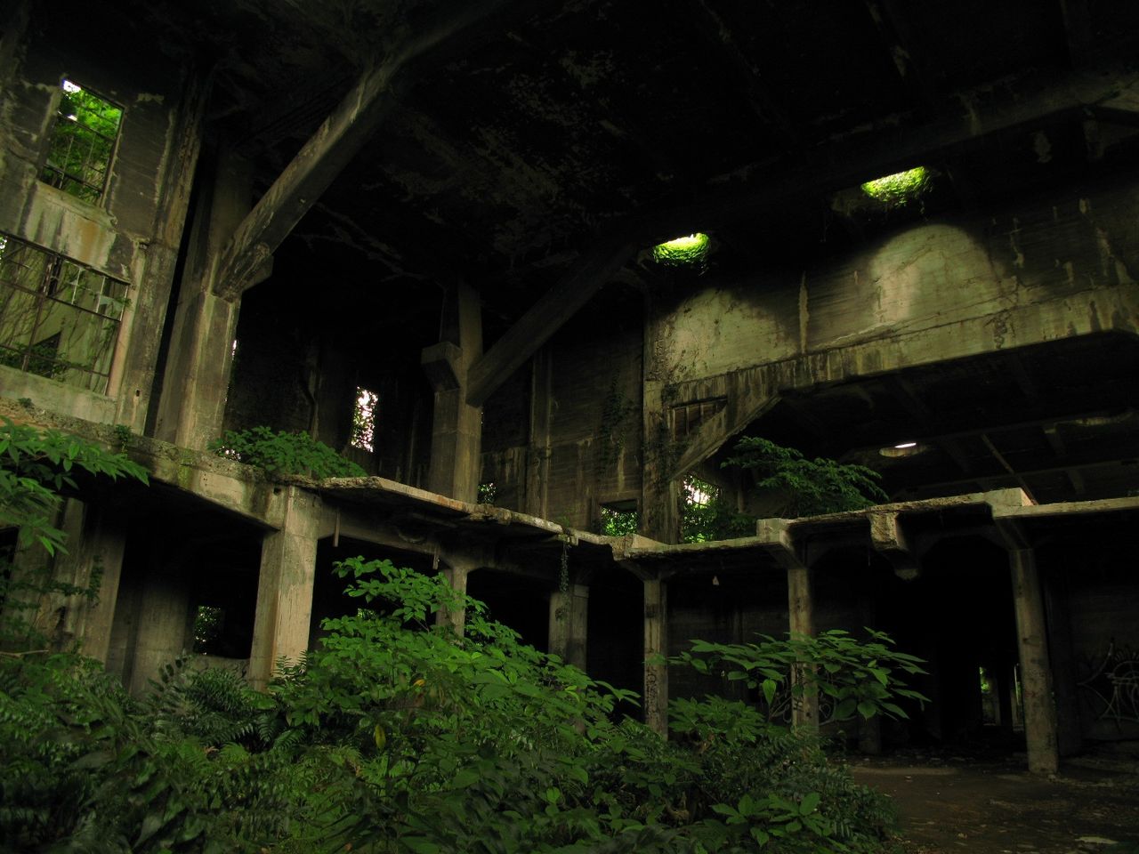 - 茂ってるなー。薄暗い廃墟に光射す感じがステキ☆