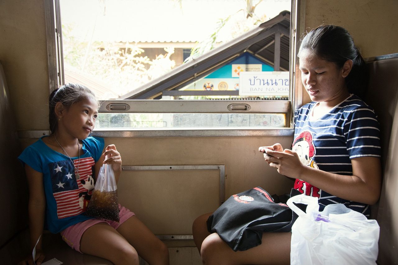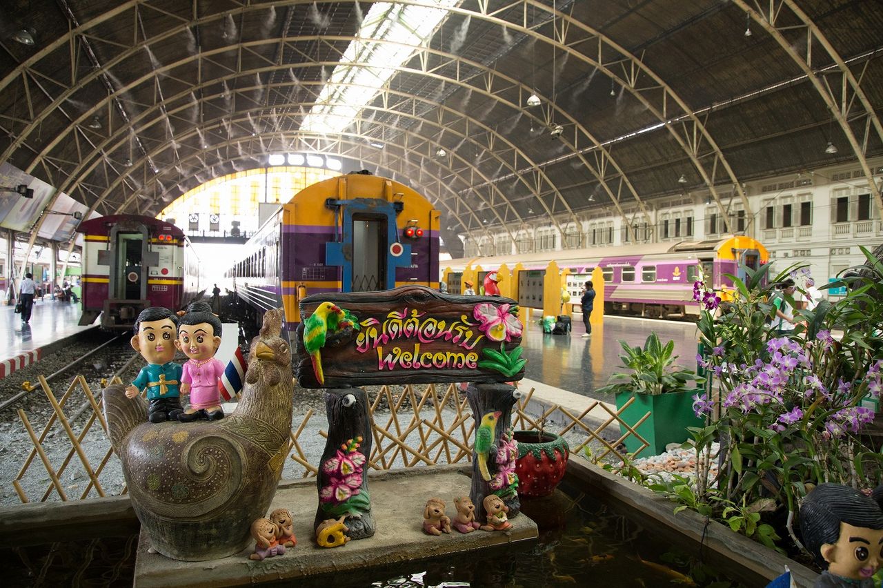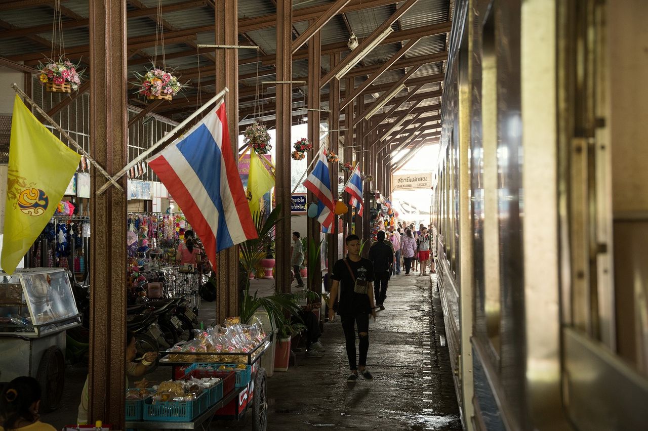 メークロン駅(車窓から)と電車を利用していた親子