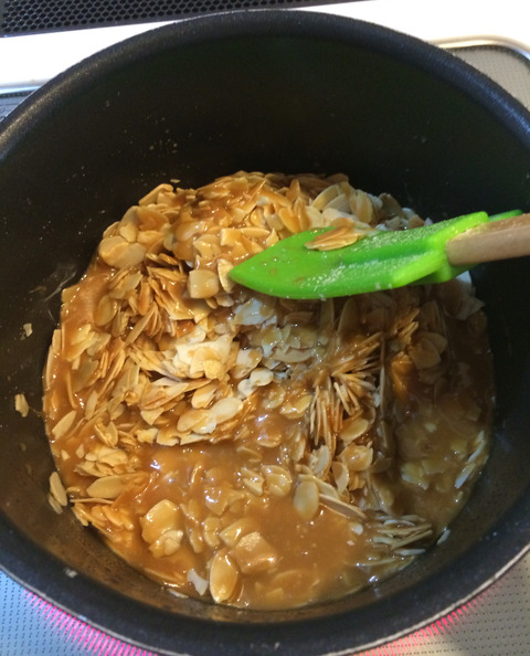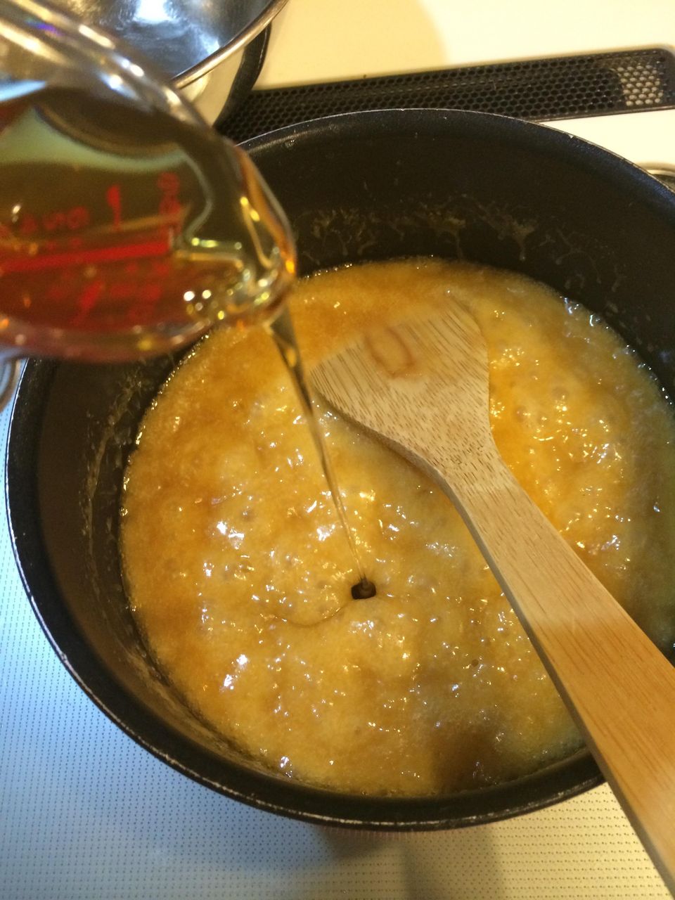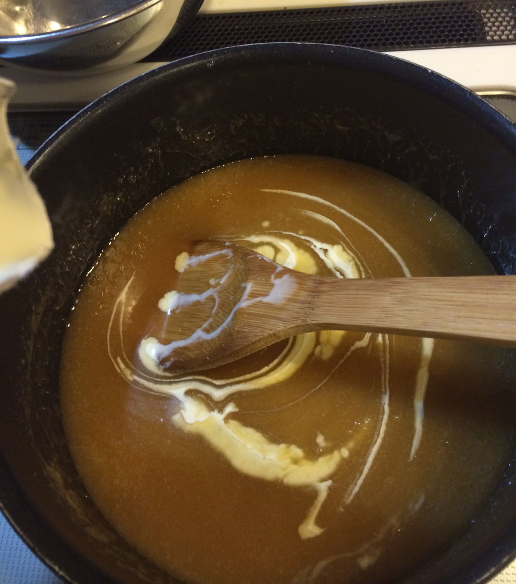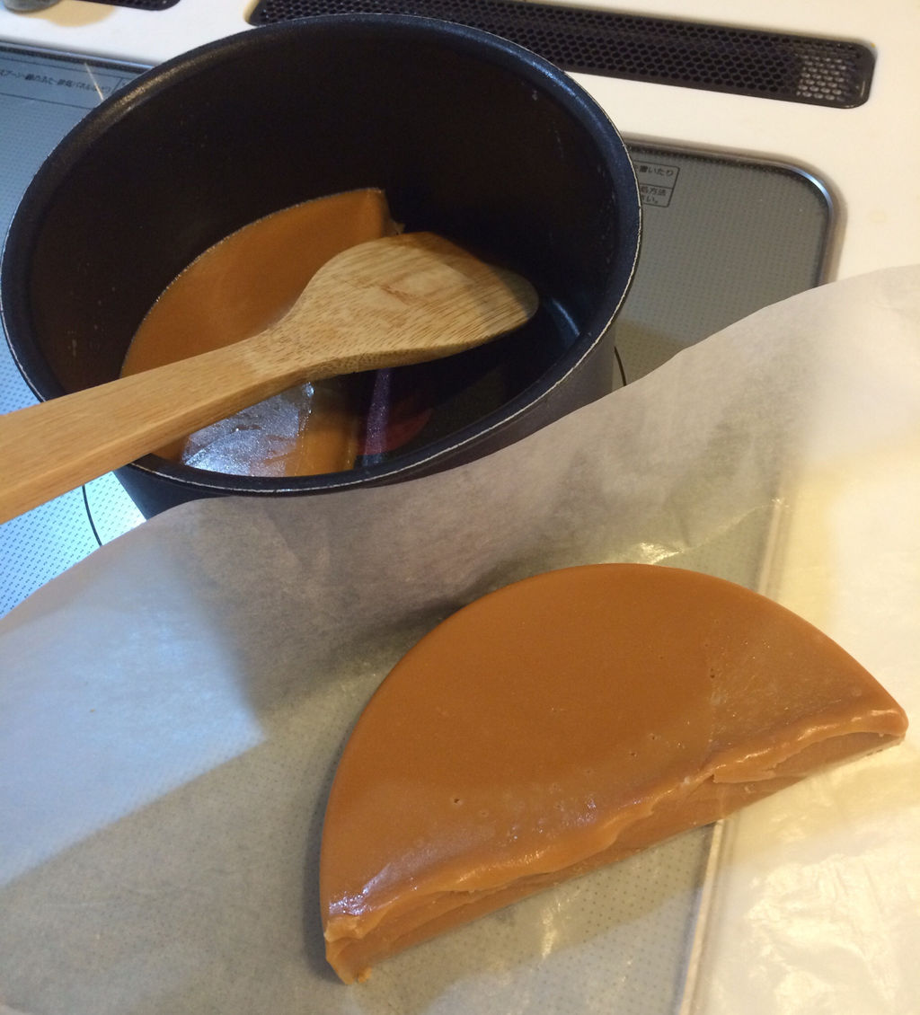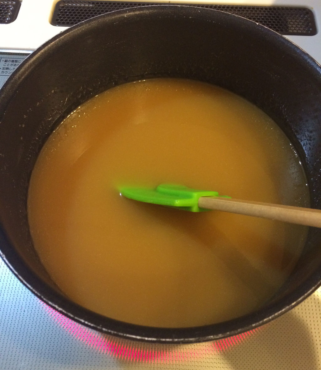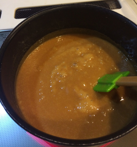 既にほんのりキャラメル色で粘度で煮詰まり具合をはかるしかなくなってしまったよ