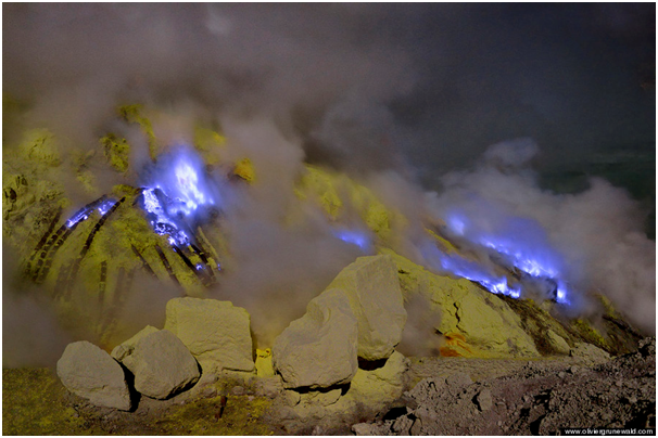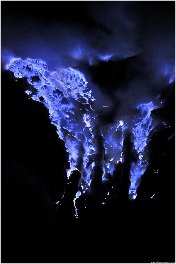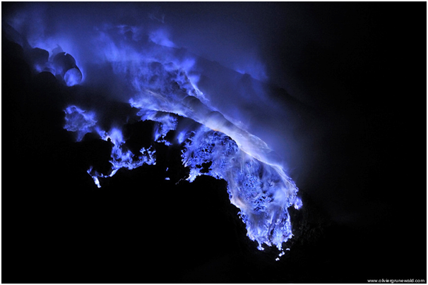 インドネシア 火山噴火の「青いマグマ」、化学幻想映画のシーンを彷彿