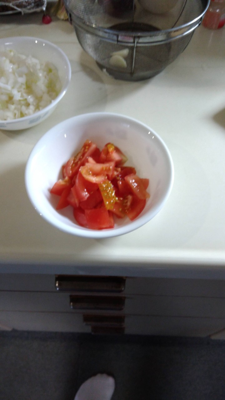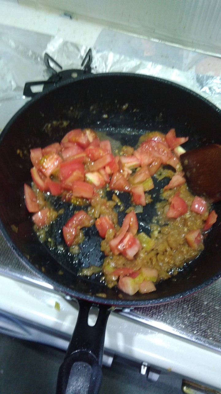 次は玉ねぎとトマトを一緒に炒めていくで