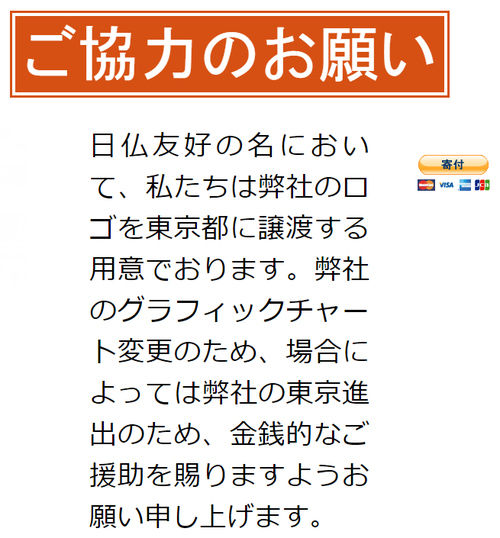 日仏友好の名において、私たちは弊社のロゴを東京都に譲渡する用意でおります。弊社のグラフィックチャート変更のため、場合によっては弊社の東京進出のため、金銭的なご援助を賜りますようお願い申し上げます。